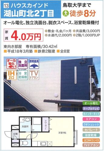 鳥取大学 周辺 アパート ハウスカインド 鳥取市湖山町北2丁目 オール電化 独立洗面台 IH2口クッキングヒーター 平成18年建築 ハウスカインド 鳥取市湖山町北2丁目 オール電化 独立洗面台 IH2口クッキングヒーター ウォシュレット・テレビモニター…